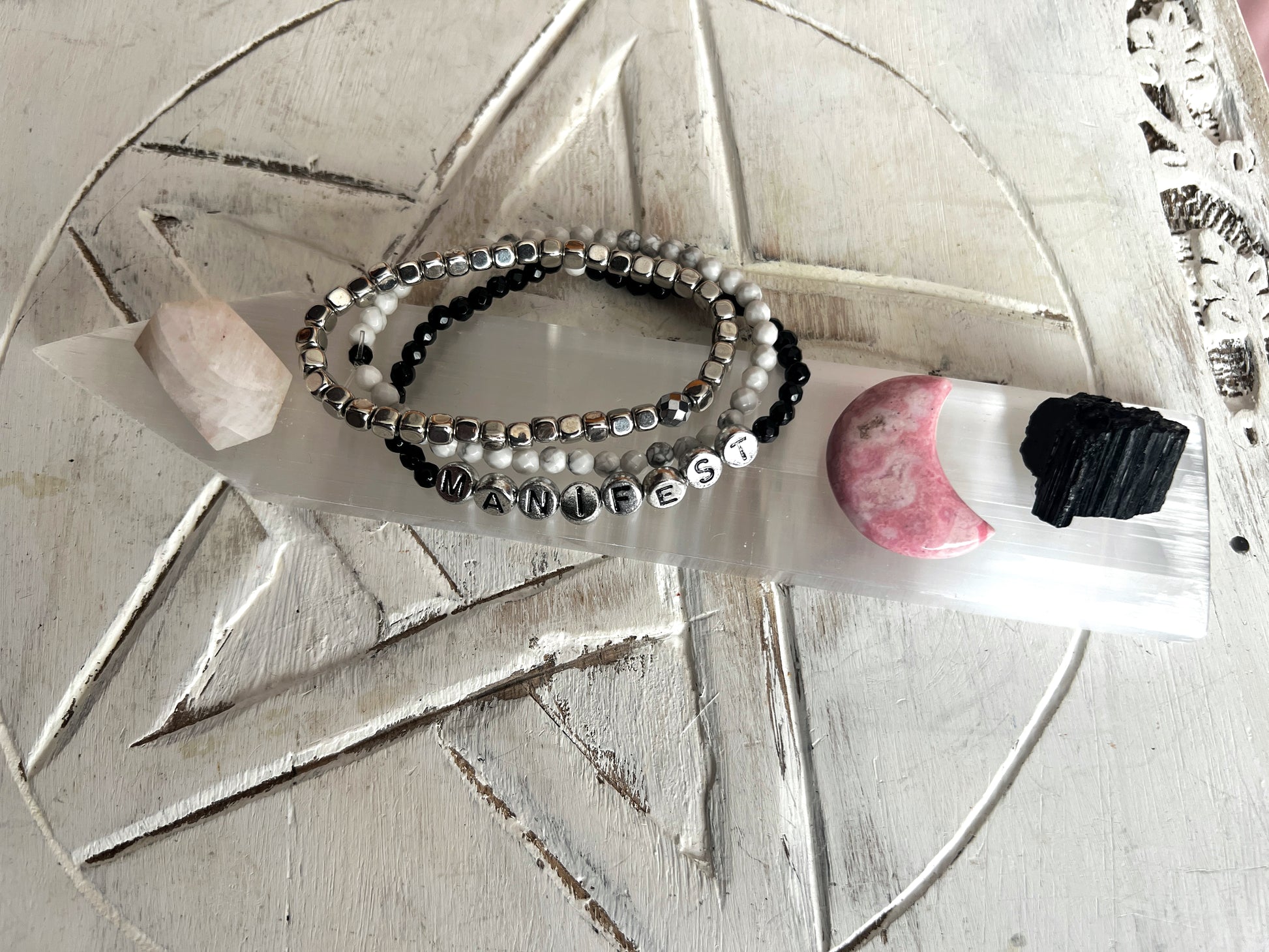 Manifest the vibes it’s definitely the magic for you with this little triple stacker set made up calming, protective gemstones with the wording ~ manifest~ to lend a helping hand to connect, Align and guide you, and support you to live your best life.